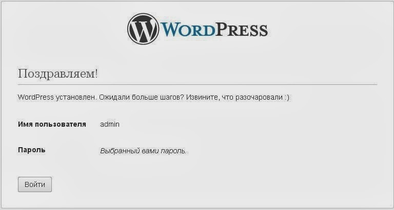 6) Всё. Wordpress установлен. Можете приступать к настройке вашего сайта и заполнению контентом.